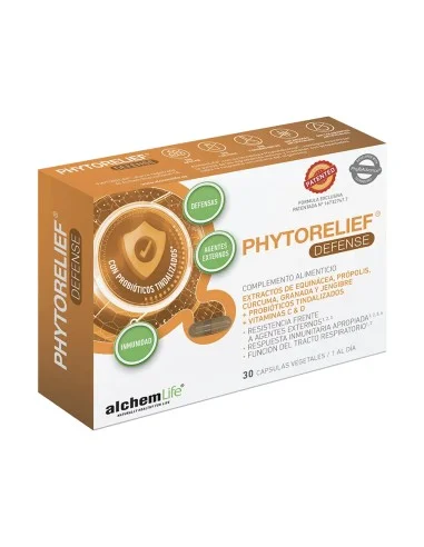 PHYTORELIEF® DEFENSE es un complemento alimenticio con extractos de Equinácea, Própolis, Cúrcuma, Granada y Jengibre + Vitaminas C & D + Probióticos tindalizados, que contribuye a reforzar las defensas del organismo.